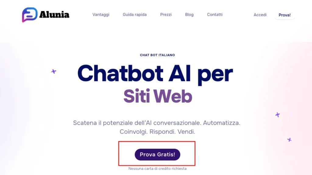 Attivare una chatbot su Alunia.it è semplice e veloce: in pochi passaggi puoi registrarti, verificare il tuo indirizzo email e iniziare subito a personalizzare il tuo assistente virtuale. Con strumenti intuitivi potrai addestrare la chatbot, testarne il funzionamento e pubblicarla sul tuo sito o e-commerce per offrire ai tuoi clienti un supporto sempre attivo e professionale.