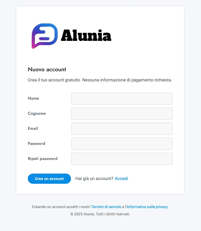 Per iniziare, vai su Alunia.it e clicca sul pulsante “Prova Gratis”. Non è richiesta alcuna carta di credito.
