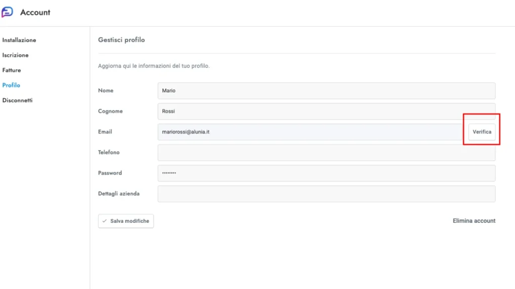 Dopo la registrazione, accedi al tuo Profilo. Accanto al campo email troverai il pulsante Verifica.