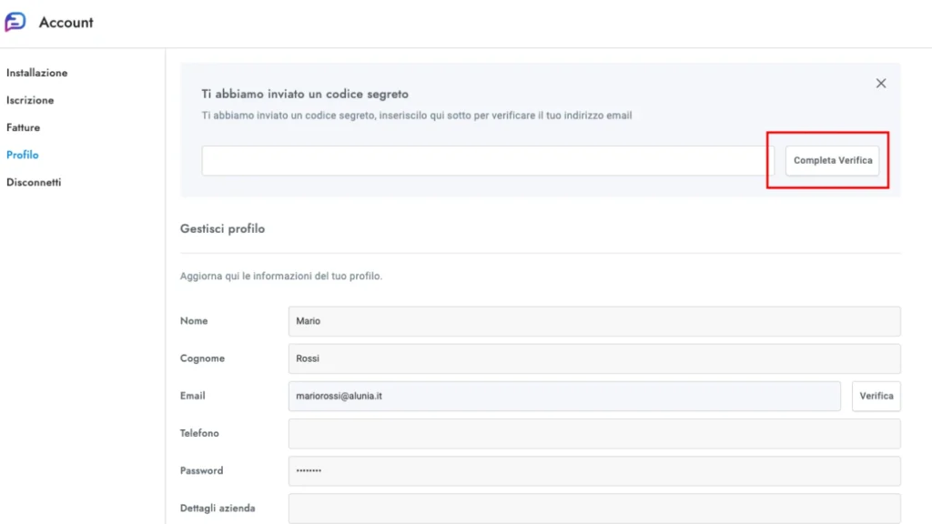 Cliccandolo, ti verrà inviato un codice segreto al tuo indirizzo email. Inserisci il codice nel campo dedicato e premi Completa Verifica.