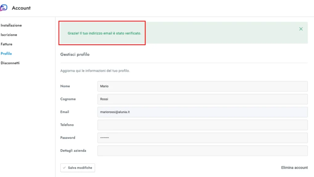Se la procedura è andata a buon fine, riceverai la conferma che la tua email è stata verificata con successo.