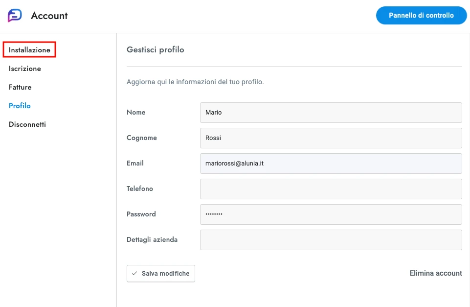 Dalla tua area clienti, clicca sul pulsante PANNELLO DI CONTROLLO