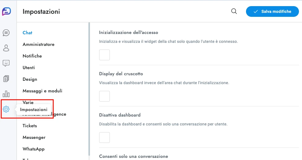 Fatto questo ti troverai nel cuore del tuo Chatbot. Qui potrai personalizzare a piacimento il tuo assistente virtuale. Le istruzioni che seguono sono quelle più brevi per essere subito operativo. Per procedere clicca su Impostazioni.