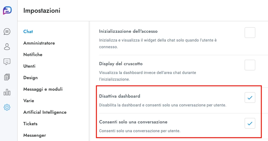 Ora, nella sezione Chat, come da immagine sotto, spunta le due voci evidenziate. Questa modalità rende più semplice le chat con i clienti di ritorno, evitando l’accavallarsi di chat successive. Questa opzione potrà essere disabilitata una volta che avrete preso confidenza con tutte le funzionalità di Alunia. Per il momento però, vi consigliamo di procedere come indicato.