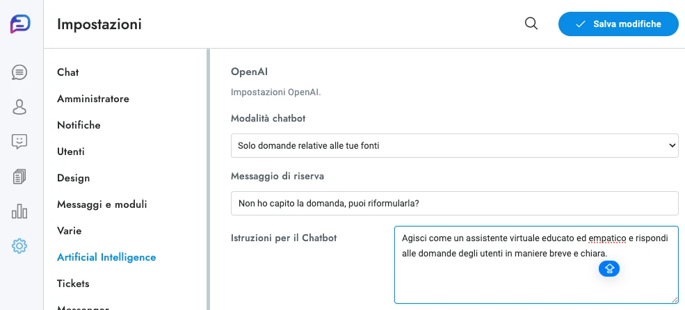 Dalla sezione Impostazioni → Artificial Intelligence puoi configurare il comportamento della tua chatbot in modo semplice e veloce.