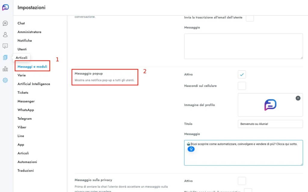2) Scorrere fino alla sezione Messaggio popup (2) e completare i campi richiesti.