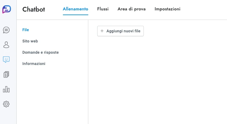- File: carica documenti, brochure o PDF che contengono le informazioni principali sulla tua attività. La chatbot userà questi contenuti per rispondere con maggiore precisione.